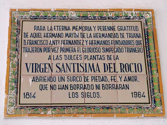 ARJONA 19 de Mayo de 2011 Si usted tiene a bien ( o a mal ) darse una vuelta por la Casa Hermandad del Rocio de Triana en El Rocio , Almonte , Huelva , podrá ver una colección de interesantes azulejos , mas por su valor de documentación histórica que por su valor artístico .- Azulejo que conmemora el ciento cincuenta aniversario de la primera llegada del Simpecado de Triana al Rocio 1814 .El 6 de junio de 1813, don Francisco Antonio Hernández y doña María del Carmen Tamayo, avecindados en la calle Castilla del Barrio de Triana, fundaron una hermandad de Nuestra Señora del Rocío. A ellos se unieron “los doce primeros hermanos que aquí se citan: don Juan de Adorna, don Benito Adorna, don Francisco Justo Pérez, don Juan Lúquez, don José Llorente, don José Sauceda, don José Gómez Mayor, don José Gómez Menor, don Juan Durán, don Pablo Fosao Vega, don José de Sirva y don Lorenzo Domínguez”.Su primera Romería la hizo el 27 de mayo de 1814 con 34 carretas y 28 caballos.- Ojo, en el 2013 ( si el mundo no se ha acabado en el 2012 ) la Hermandad de Triana cumplirá DOSCIENTOS AÑOS . Curiosamente el excmo sr comunista Torrijos que esto de la religión le produce como alergia , le ha concedido la réplica de la medalla de la ciudad a la Hdad del Rocio de Sevilla Sur por cumplir 25 años . Tambien es curioso que el sr Francisco Fernández, el de (In) Momovilidad Ciudadana que lo han dejado fuera de la lista ( para suerte de los conductores de Sevilla ) del PSOE,del candidato Espadas, igualmente da otra medadilla a Hermandad del Rocio de su barrio del Cerro que cumple tambien las bodas de plata . Por esta regla de tres en el 2013, caso que estemos todos vivios, le tendrán que dar a Triana por lo menos cuatro medallas de la ciudad , al cumplir cuatro veces el 25 aniversario y que todavía no le han dado ninguna por ser feudo de votantes del PP .- Este azulejo es muy interesante