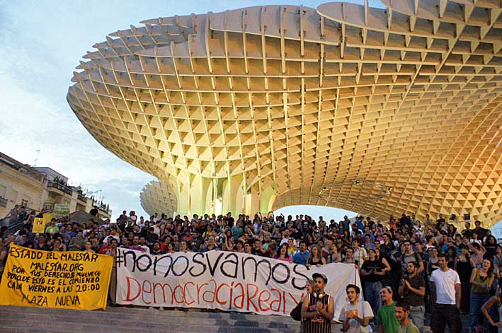 ARJONA 18 de Mayo de 2011 Un servidor veía como en el Twittter la palabra #ENCARNACION ( no de la Calzada ) se posicionaba como favorito , como tema del momento en nuestro pais y no precisamente porque la Setas sean el CUARTO EDIFICIO MAS FEO DE ESPAÑA , en la "tierra donde nació Felipe Gonzalez "( antes de Maria Santísma ) .- Una especie de "Pásalo" , pero por las redes sociales, dias antes de unas elecciones ( mmm esto ya lo hemos vivido antes ) . Se encamina uno hacia esta concentración, supuestamente espontanea, encontrandose con esto . Almas mias, cuando pasó por este mismo sitio , La Cena o San Roque el Domingo de Ramos había mucha mas gente . El domingo pasado, al final de la Palmera, había diez veces mas de criaturitas que lo que se ve en la foto, gritando que: "Habian vuelto" ( como son las "criaturitas del Universo" y verdes igual regresaban de algún planeta muy, muy lejano ) . Ya sabemos para que pueden servir las setas , para manifestodromo, que alli proteste todo el que quiera, lejos de cualquier organismo público ... socialista .Aqui no hubo como en Madrid asistencia de apesebrados, malos y subvencionados actores , que son malos hasta para interpretar a "desesperados sociales" - Este movimiento denominado "Democracia real ya " , tambien denominado #NONOSVAMOS , que suena a Verano Azul cuando a Chanquete lo querian echar del barco donde vivía, algo perfectamente orquestado y organizado , es como una cruz de mayo mala por lo societario, del Mayo de 68 francés o alguien ha querido compararlo con los levantamientos sociales ( y petroliferos) de los paises arabes de juguete con nombre de playstation #SPANISHREVOLUTION o #YESWECAM .- Nos han montado un circo dentro del perfecto aparato de prestidigitación socialista , todo un espectáculo con nombres como #ACAMPADASEVILLA ( no sabemos si para sestear o pecnoctar , por aquello del Rocio ) y asi lo distraen a usted de los cinco millones de parados o la vergonzante rendición ante "eta" de todo el aparato del "estado"( tiene la cosa faisanes ) que tenemos en mala suerte , a nivel nacional . De las ERE y de los papeles robados de Ivan y su papa el "bueno de Manolo" a nivel autonómico . De las facturas falsas de MercaSevilla, de las "mariscadas de las desigualdade"s, de los domingos con avenidas cortadas o de una forzada sola dirección; del Gueto-Centro; de ediles comunistas en piquetes rompe-bares el dia de la Juerga General o la inexplicada duplicidad del coste de este inmenso mojón de derroche inutil como las setas de la #ENCARNACIÓN .- El problema, es que esto de las redes sociales las carga el diablo y miren por donde este "movimiento social" , que te empujan al no voto o al voto nulo , se les ha visto parte del truco , como a los magos malos, y este apolítico manifiesto apareció casualmente publicado en la pagina del PSOE , o sociata como dirian estos ácratas manifestantes, muchos con un cuidado look de "niños perro flauta" ( con perros incluidos ), sin pasar por la ducha ellos, y sin depilarse los sobacos ellas (no usando desodorante , ni depilandose, por lo visto se es mas libre, mas laico, mas tolerante , mas social y politicamente correcto ) , entre gritos de "Menos crucifijos y mas trabajo fijos", como la intervención de estos mismos supuestos anti-sistemas recientemente en Granada de una forma "democrática y legítima" profirieron todos tipo de insultos y consignas al paso de la Virgen del Rosario ( mmm esto tambien me suena ), como mejor forma de frenar las crisis .- Es curioso, que esto no se haga frente al Parlamento Andalúz o frente a San Telmo ( con le pedazo de acera que hay y los millones que ha costado ). Es curioso que esto no se haga frente al Ayuntamiento. Lo hacen frente a la Anunciacion sede de la Hermandad del Valle , hombre, el paño de la Verónica de este año era horroroso , pero no es para tanto .- Muy desesperada tiene que estar la extrema izquierda, para sacar a la desesperada , en los umbrales de unas elecciones , este circo de marionetas ( movimientos okupas, antisistemas y demás guerrillas urbanas a la calle) , movidos con los ciber-hilos de la red , manipulados desde la sedes centrales de un partido que ven como su "empresa" se les viene a pique , incluido sus accionistas mayoritarios y millonarios, los sindicatos estatuarios . ¿ Por tan gilipollas nos tienen, que piensan que nos tragamos toda esta burda maniobra de ilusionismo y de distracción ? .- No olviden una cosa, en democracia, no se vota a nadie, se vota "en contra de alguien",. Por favor, el domingo próximo vote a quien sea, pero vote, pero exactamente en contra de todo lo que tenemos ahora mismo metido Sevilla, Andalucia y Ex-paña , logicamente a menos que sea usted un "rojo estomago agradecido", pues si usted estan trincando sería estupiod por su parte , que dejara de hacerlo al frente popular ( socialista + comunista ); tan tonto como si no trinca nada, es uno de los cinco millones de parados o un bellaco congelado o recortado socialmente y de propina los vota, entonces pasaria directamente a la categoria de tonto con balcones a la calle .-