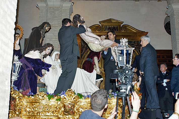 Si el otro dia les comentaba que quizás el misterio que mas se representaba estos dias por los equipos de priostía era el de la "exaltación" de Crucificados , aqui vemos a varios "Nicodemus" y a varios "José de Armatea " de carne y hueso, llevado y portando a Jesús, hacía su mortaja , entre los auténticos personajes protagonista de la Pasión , para como cada Lunes Santos , entre cirios azules ser trasladado al sepulcro .-
