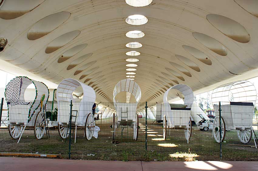 Si se fijan en la foto superior , parece una instantanea de la mítica serie Star Treck , como si de las tripas de la nave Enterprise, estuviera almacenadas unas carretas abducidas . Dejando fantasias ( y tonterias ) estelares a parte , lo que ven aqui son los bajos del puente del Alamillo ( un puente mas macareno que el arco ) , donde bajo su viaducto , se preparan y engalan sus carretas, que como no se si sabrán , todas tienen el mismo exhorno ( una peculiaridad de esta Hermandad ) .-