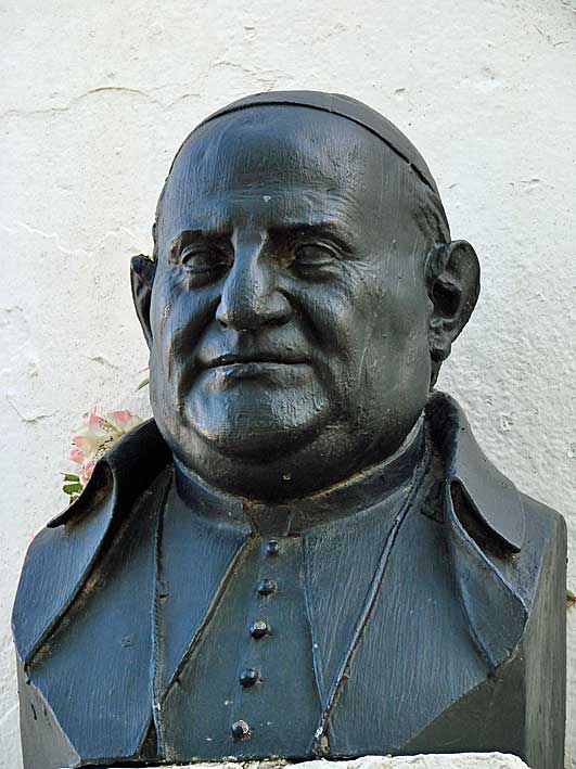 Este busto que aqui ven pertenece a unos de los Pontífices mas emblemáticos y carismáticos del siglo XX, Juan XXIII , que esta colocado en la plaza y en la barriada del mismo nombre de nuestra ciudad , obra del escultor Sebastian Santos Rojas por encargo municipal, fechada en 1972 . En la actualidad, está en este enjaulado monumento , para protegerlo de los ataques de los vandalos ( y alanos ) , amigos de pintarraquear y dañar monumentos ( que se lo pregunten a las padecidas esculturas del Paseo Colon ) .-