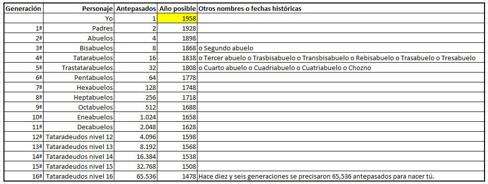 Me hace una inquietante pregunte y la tabla superior que invita a reflexionar: ¿Se han preguntado, alguna vez, cuántos antepasados han hecho falta para que uno nazcas? El señor Sigúenza he resuelto la cuestión, en la tabla adjunta y las cifras son mareantes .- No se si se acordaran de la en su época famosa serie Raices y el amigo Kunta Kinte , basada en la novela de Alex Haley que publicó en 1976 "Raíces: la saga de una familia estadounidense", una novela basada en el arbol genealógico de su propia historia de su familia, empezando por la historia de Kunta Kinte, que habría sido secuestrado en Gambia en 1767 y transportado a la provincia de Maryland para ser vendido como esclavo. Haley dijo ser un descendiente de séptima generación de Kunta Kinte y el trabajo de Haley en la novela le llevó diez años de investigación, un viaje intercontinental y la escritura. Fue a la aldea de Juffure, donde Kunta Kinte creció y que todavía está en existencia, y escuchó a un historiador tribal cuentan la historia de la captura de Kinte. - Si tenemos en cuenta que Alex Haley nació en 1928 y llegó solo hasta la séptima generacion 1767 , según el cuadrante necesitaron solo de 64 personas , con sus aventuras y desventuras , para que este buen señor naciera .- Si en algún momento se ha plantaeado esto de liarse a coleccionar fotitos de familiares y hacer su arbol genealógico y colgarlo en el salón junto al mueblebá . miren antes estas mareantes tablas y pongase un tope de hasta donde esta dispuesto a llegar .Para que se situe, cuando Rodrigo de Triana grito eso de "Tierra a la vista" ya habian nacido 65.536 personas para que usted naciera en la mitad del siglo XX .- Cuando colocaron el Giraldillo el 15 de Agosto de 1568 , tenia que haber nacido 8.192 hombres y mujeres para que usted naciera , si tenemos en cuenta que en aquella época , bajo el reinado de Felipe II , habia en Sevilla 12.121 casas habitadas por 66.244 adultos y 12.967 niños y 6.325 esclavos , lo que hace un total de 85.536 habitantes , oiga un 10% de la población si son todos antepasado eran sevillanos . ¿ Serian esclavos o esclavas algunos de nuestros antecesores ? .- Cuando Juan de Mesa talló el Gran Poder en 1620 ya habian nacido 2.048 de sus antepasados . En 1728 cuando se construyo la Fábrica de Tabacos ( hoy Fábricas de Parados ) , bajo el reinado de Felipe V , ya eran unos veinteañeros los 128 de sus antepasados y posiblemente estarian engendrando la generación siguiente ( lo mas porbable pues en aquella época no habia ni TDT, ni liga de fútbol ) .Durante la Guerra de la Independencia tendria que nacer ( a pesar de todo ) 32 antepasados suyos y cuado el desastre de Cuba en 1898 nacieron sus cuatro abuelos .- Es para reflexionar y dejar volar la imaginación ¿ quienes serian nuestros decabuelos o hexabuelas , que hicieron, como vivieron ,como murieron ? .- Prohibida la