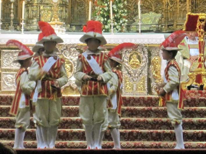 Pero si merito tiene el fotógrafo, mas merito sin duda tienen los niños y niñas , que para nada son huerfanos o que abducidos por una nave extraterrestre de pronto aparecen en la Inmaculada, Carnaval o Corpus . Son niños y niñas, con sus papás y mamás , alumnos todos del Colegio Portacoeli ,( donde ensayan durante todo el año ) que en 1982 tomaron el relevo a los niños del desaparecido Colegio de San Miguel y para que se hagan una idea, los seises tiene que estar como los jugadores de futbol dos horas antes para vestirlo uno a uno, pues sus característicos trajes no tiene botones, todos se sujeta con lazos, y para desvestirlos otro tanto ( no viene vestidos asi desde sus casas ) ; mientras las niñas y niños del coro una hora antes ( se lo dice un sufrido padre de una antigua alumna y miembro de esta coral por dos temporadas ) que de propina han estrenado hace poco una especie de habitos monásticos blancos , que ya se pueden imaginar como les tiene que sentar termicamente en las fechas en que nos encontramos .-