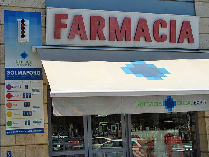 Aquí tienen a la farmacia, mas fotografiada y filmada, en el día de hoy en Ex-paña, donde su propietario/a dará sin duda por bueno el dinero empleado en este absurdo chisme , que lo ha armotizado con una espectacular campaña de publicidad de noveleo con la que se ha encontrado , amén de escaparate del producto a nivel nacional . Entonaré el mea culpa .- No está en Sevilla, está en Mairena del Aljarafe provincia de Sevilla ( aunque muy próxima a ella ) y para llegar allí desde nuestra ciudad, les aseguro que hay que dar mas vueltas que Marco buscando a su madre . Si quiere saber mas sobre la vida y milagro de este invento, aqui lo pueden encontrar SOLMAFORO y lo usado que es en Chile y la cordillera andinas ( precisamente Marco tambien estuvo por allí ) , que esta como bastante mas alto , tela de alto , que la cornisa aljarafeña, Gracias a este maravilloso aparato sabemos que cuando esta en rojo hay que evitar exponerse al Sol, buscar la sombra , Imprescindible camisa, sombrero, gafas de Sol y crema protectora . Estaran conmigo que esto es un invento mágnifico ,no sabemos como hemos podido vivir sin él hasta ahora , pues cuando vemos los anticuados termómetros que marcan 39ºC pocos minutos después en la Plaza de América de Sevilla ,el termometro no nos informa de lo que hay que hacer, no sabemos que hay que buscar la sombra , el aire acondicionado o un Mirinda helado y como estamos acarajotados estamos expuestos a una insolación . Menos mal que ya tenemos este nuevo.... descubrimiento de la polvora .- Ya puesto, podríamos poner un PAROMAFORO ,en rojo muy alto en las Oficinas de (Des) Empleo de Andalucía ; un EREMAFORO en rojo chillón en las puertas de San Telmo y del antiguo Hospital de las Cinco Llagas, un NOPASANÁMAFERO en rojo extremo en las puertas de nuestro Ayuntamiento o un HIPOTECAMAFORO en violeta extrema en las puertas de cada banco y excajas de ahorro jugando a los bancos ; resumiendo en las entradas de Sevilla y Andalucia se podría colocar un JARTOMAFOROS de todos sus sus habitantes por no poner un ESTAMOSHASTALOSCOJ..(PIIIII)MAFOROS , del que ya no habria colores en el arco iris , para definir nuestro estado de ánimo .- Prohibida la
