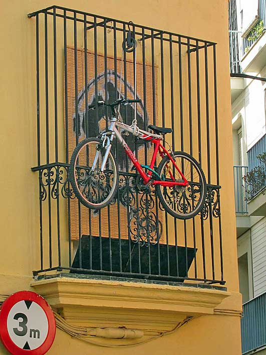 Si les soy sincero, al contemplar esta imagen he dudado : ¿ Esta pobre bicicleta esta aparcada de esta forma tan peculiar o simplemente se ha suicidado colgandose de un balcón ? . ¿ Estaremos ante el nuevo renacer de las garruchas y poleas , cuya instalación se pueden ver en algunas casas sevillanas, que facilitaba la subida de objetos a los áticos, altilllos y/o/u cambras de las casas sin entrar en ellas ? .- Lo que si está claro, es que con la cantidad de chorizos que hay en Sevilla ( nacionales, comunitarios y de importanción ), la cosa se tiene que poner muy mala , para que no desaparezca de esa colgadura , aunque si se fiján el velocipedo esta atado a la reja con una "pitón" , a modo de palma de Domingo de Ramos . Igual , no es un aparcamiento es un acto de homenaje público al uso de este vehículo de tracción de sangre humana ( como son clasificados en la legislación de tráfico de paises sudamericanos ) .- No muy lejos de donde está la "bicileta suicida", encontramos otra un tanto ajada , casi un clásico pieza de museo, en un estado de conservación para nada aceptable, trás sufrir las inclementecias del tiempo del Sol a mas de 40ºC al Sol ( y no es una redundandacia ) y la lluvia .- ¿ Estaremos ante una nueva moda del carril-blacón -bici ?. Señoras, lleven cuidado cuando vaya a tender la ropa , pues igual las arrollan con total impunidad un ciclista, sin matrícula, sin impuestos y sobre todo sin seguro de responsabilidad civil , tocando su irritante timbre, cual Spiderman pedaleante ...subido por las paredes y balcones .- Lleve cuidado, igual no le atropellan , simplemente va por la calle y se le cae una bici en la cabezas .- Pagina diseñada