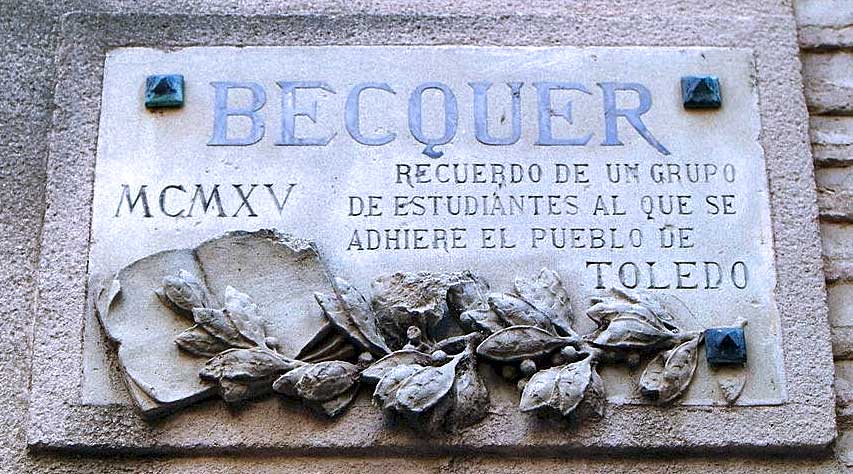 Esta fotos y las dos siguientes con sendas placas en su honor estan en la Plaza de Santo Domingo el Real uno de los lugares preferidos por Bécquer , el sitio donde se ha concentrado el mayor número de homenajes que se le han tributado. Esta plaza era una de los lugares preferidos y más visitados por Bécquer, habitualmente recorrida por él e inmortalizada en sus rimas cuando de ella escribió "A oscuras conocía