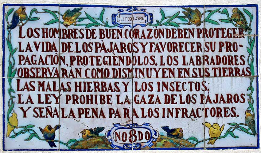 sus nidos. Dios premia a los niños que protegen a los pájaros, y la ley prohíbe que se les cace, se destruyan sus nidos y se les quiten las crías”. Lo cierto es que el Ayuntamiento de Sevilla hizo caso omiso de esta disposiciones y tuvo que ser el médico Antonio Ariza Camacho, quién logró que estos lienzos cerámicos se colocaran por lo menos en la puerta de los colegios allá en los inicios de la década de los felices años veinte del siglo XX . En el mismo azulejo, a pesar de su ecología , aparecen juntas las palabras NIÑOS y DIOS, algo hoy, social y politicamente incorrecto .- La ley del 19 de septiembre de 1896 fue expresamente derogada en 1995 ( por lo visto dejaron de tener los mismos privilegio que el lince millonario ) Como los azulejos de Cervantes , hay todo un "via crucis" cerámico ecologista, en diferentes colegios, de Sevilla y milagrosamente ha llegado hasta nosotros , en un estado aceptable ( cosa rara ) . Es curioso porque parecen todos iguales, pero si se fijan veran que nada mas lejos de la realidad, pues cambian los colores , en algunos aparece abajo el NO8DO, en otros no, incluso hay dos casos que cambia el texto :