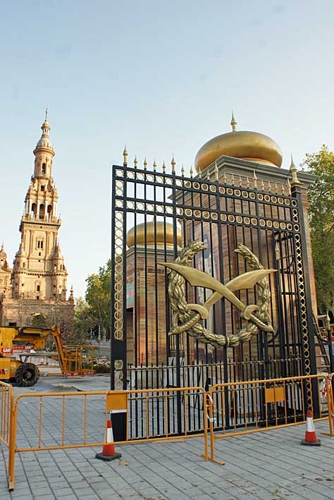 Lo dicho los sevillanos no las pintamos solos para cargarnos en nosotros mismos . Esto es fruto de una carencia de medios e ignorancia cinematográfica por el aquiencorresponda de turno que ha autorizado esto, pues se puede rodar en Sevilla sin modificarla aunque sea efimeramente .¿ Se imaginan esta chapuza en otros monumentos europeos ?.- En el vidio superior escenas de peliculas en la Plaza de España de PAN AMOR Y ANDALUCIA ,LAWRENCE DE ARABIA y STAR WARS EL ATAQUE DE LOS CLONES .- En el siguiente video de EL VIENTO Y EL LEÓN a partir del minuto cuatro veran la Plaza de España , seguida de la Plaza de América de Sevilla Prohibida la