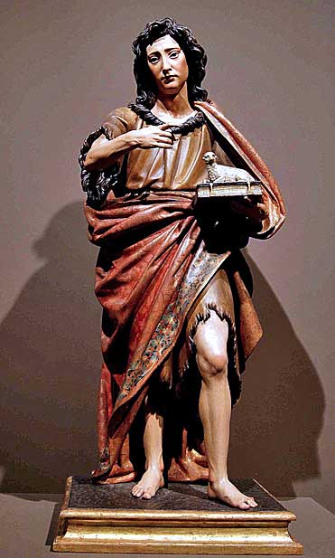 E A) La primera pertenece al inconmesurable retablo de San Juan Bautista según se mira el altar mayor es la derecha de la Iglesia de la Anunciación ( El Valle ) de Sevilla , está el retablo de San Juan Bautista, que compró el Estado Español al Monasterio de Santa María del Socorro, para depositarlo en este templo en 1972 .Fue tallado entre 1610 y 1620 por Juan Martínez Montañés y policromado por Juan Uceda Castroverde.- B) Este Juan Bautista esta en la Iglesia del Convento de Santa Paula de Sevilla tallado en 1638 .- C) Juan Bautista esta en un retablo de la Iglesia del Convento de Santa Ana ( barrio de San Lorenzo ) Sevilla .- D) Este es mas doloroso pues este Juan Bautista enta en la Iglesia del Convento de San Leandro de Sevilla , que se está cayendo mas a pedazos que la mediática Santa Catalina, ante la indolencia de nuestras autoridades (in)culturales estatales, autonómicas y municipales, asi como eclesiásticas ( no todo es restaurar Parque Temática Catedral, cambiando solerias ) . Un Martinez Montañés ( como casi todo lo que hay dentro ) de 1621 . De verdad para eso que lo venda a algun museo norteamericano y con lo que saquen seguro que restauran todo lo demás .- E) San Juan Bautista, para el entonces Convento de Santa Clara,( en la actualidad llamado "espacio Santa Clara" ) de Sevilla, y que estaba dentro de una impresionante Iglesia que allí se encuentra incomprensiblemente cerrada a cal y canto. Hoy se puede ver en la Fundación Focus-Abengoa ( Hospital de los Venerables de Sevilla ) .- ¿ Como ha ido la cosa ? . Pues ya sabe, aproveche para verlos, los tiene aqui en casa y sin que les cueste un duro .- |