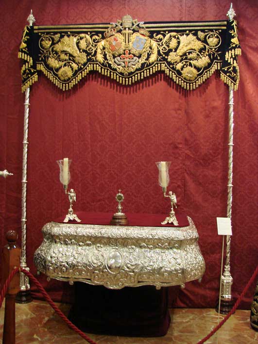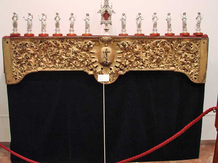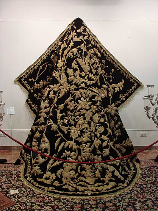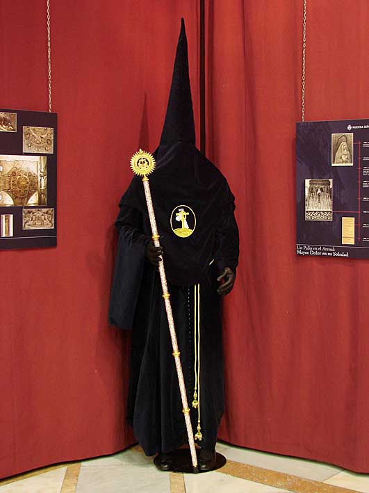Esta primera sala acoge, asimismo, el manto y las dos sayas que vestía la Dolorosa cuando formaba parte del paso de misterio, ahora de la Virgen de la Luz, y el último traje de luces que usó el torero Curro Romero y que donó a la hermandad. |