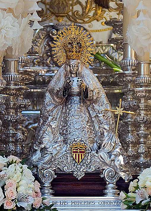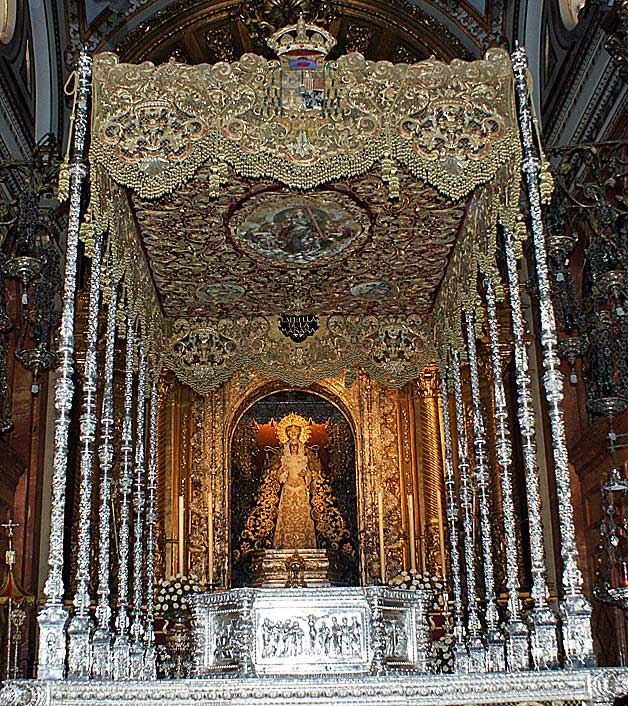 Llegamos a la sección de llamadores , en este caso de pasopalio de la Virgen de las Mercedes de la Hdad de Santa Genoveva, donde vemos a las tres Virtudes Teologales . la Caridad, en el otro extremo la Fe y en el centro , en una miniatura en plata independiente , la Esperanza....Macarena .-