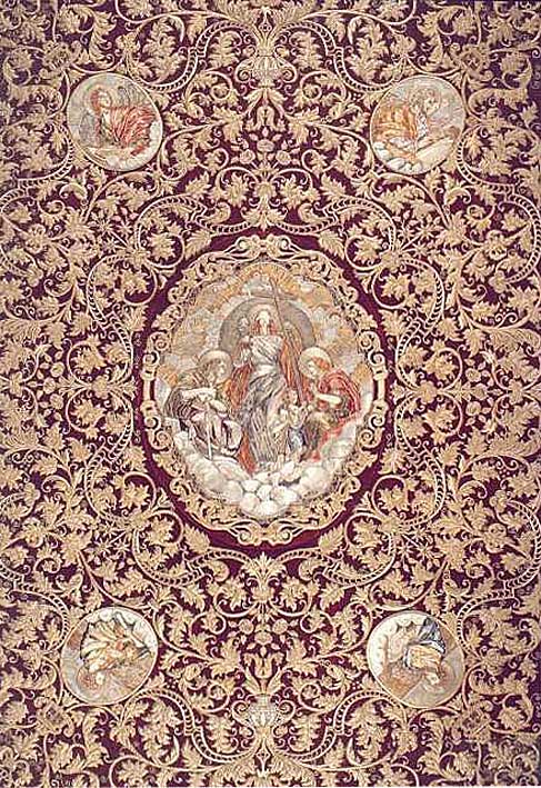 La siguiente Fe la vemos en la gloria central del inconmesurable techo de palio de Ntra Sra de la Esperanza Macarena , junto a las dos Virtudes Teologales, la Esperanza y la Caridad. Si va al Macarena en el paso entra dentro de los humanamente lógico que usted amable lector, desgradable y leal detractor, no haya reparado en este detalle .-