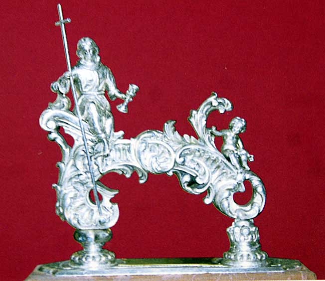 Esta ya es mucho mas complicada . Sobre cada una de las capillas de canastro de la inmortal obra de Cayetano Gonzalez de paso del Señor de Pasión ( La Plaza de España de plata , copirai Antonio Burgos ) se muestra cuatro pequeñas esfinges de la Inmaculada, la Fe, la Esperanza y la Caridad . Aqui pueden ver la Fe sedente en las vitrinas de la casa hermandad de Pasión, que va colocada en una de las meritadas capillas .-