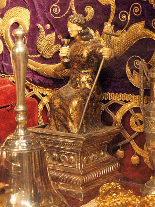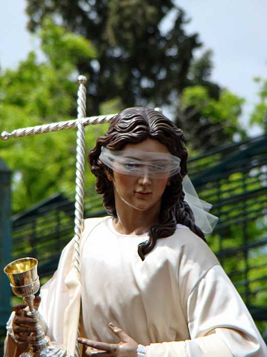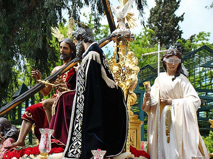 La siguiente representación de la Fe , es una talla va en el alegórico paso de Misterio del Sagrado Decreto de la Hdad de la Trinidad , esquinada a la siniestra de Dios Padre. Obra de D. Antonio J. Dubé de Luque talló , La Fe (1996) , además de San Gregorio (1994), San Ambrosio (1995), San Agustín (1996) .-