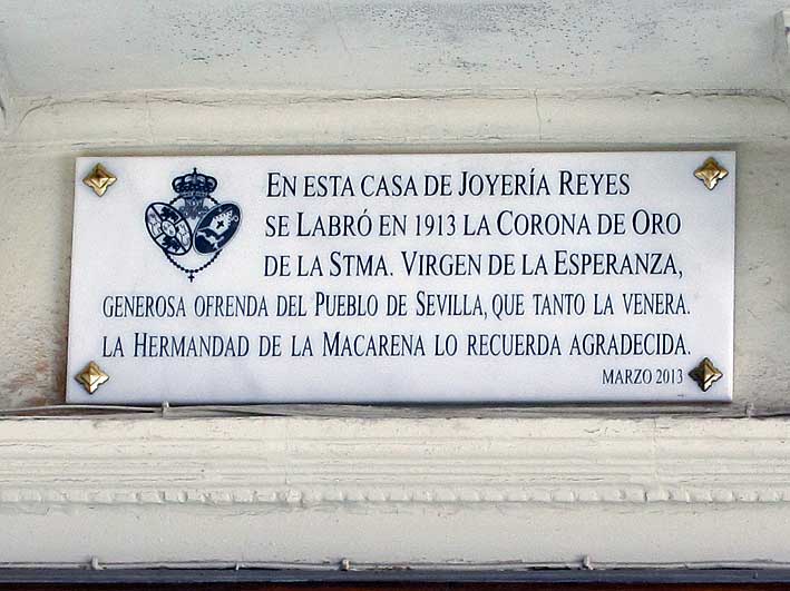 La corona se habia realizado en oro de ley a buril esgrafiado por la prestiogiosa joyeria de D. José de los Reyes , sobre diseño del genial Juan Manuel Rodríguez Ojeda , cuando ocupaba en la Junta de Gobierno de la Hdad de la Macarena el cargo de Consiliario 2º. Con motivo de tal efemérides se coloco "antié", esta lápida en las puertas de la sevillana Joyeria Reyes .-
