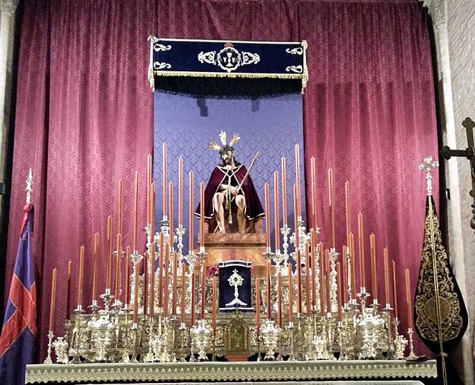 12 de Febrero de 2013 Hoy en nuestro diario de navegación del noveleo sevillano ( como dice una persona a la que quiero mucho : " Los sevillanos sois muy fieles solo al momento " ) , les traigo esta instatanea para nada novelera, sino que con su total normalidad y habitualidad ha dejado en evidencia tanta extravagancia envuelta en un papel de celefán de justificar lo injustificable .- Aqui, tienen al Cristo de la Salud y Buen Viaje, el único Cristo que llora de Sevilla, el Cristo que ha abandona su ventana de guardia de 24 horas, para presidir su ALTAR DE QUINARIO.- Este Sagrado Titular, en su paso de Misterio de la Hdad de San Esteban, participará en Vía Crucis de una Año de la Fe, pero con un Papa que ha pedido la cuenta y se ha pre-jubilado .Vivimos unos tiempos donde por lo visto los Papas no se fabricaban como los de antes. Recordemos a Pio XI,( inventor de los piononos) Juan XXIII, ( El Papa Bueno) Pablo VI , el efimero Juan Pablo I , con su misteriosa como rapida muerte y el emblemático Juan Pablo II, que lo querina en todo el mundo menos en Sevilla, a pesar de ser el primer Papa que nos honró por dos veces con su presencia y que llegó a dormir aqui .Un flaco favor a los católicos y a la Iglesia Católica le ha hecho Benecidto XVI , al hacer como el fraile del chiste y decir el famoso : "Me Voy " .- Se estan escuchando monumentales rebuznos , olvidando algo tan básico como que un Papa, ES EL VICARIO DE CRISTO EN LA TIERRA, ( o por lo menos eso nos enseñaron y recordaron hasta la saciedad ) no es el director general de una Caja de Ahorros arruinada. Que envidia de la Reina Isabel II de Inglaterra ( una REINA con mayusculas) que ademas es la cabeza visible de Iglesia Anglicana , que tiene que estar harta de coles con 87 años y ahí esta aguntado el tirón. Eso es dar ejemplo, eso es dar testimonio, y no cojer la puerta. Los Papas no se inventaron patra dimitir , sino para morir con las sandalias del pescador puesta ( por cierto magnifica novela y película ) .- Como les decía tras este paréntesis de comentario de actualidad , esta Hermandad participante en este híbrido Santo Entierro Magno -Munarco, va a celebrar a partir de hoy sus cultos , como sencillamente se celebran en Sevilla, en un ALTAR DE QUINARIO , no montado encima de un paso, como ha ocurrido con otras dos Hermandades tambien participantes, que llevan tanto tiempo montados, con sus "Cristos" ( como diría nuestro Pastor ) que cuando llegue la hora de la verdad ( si la bendita lluvia no lo remedia) , tendrá que volver a limpiarlos, pues ya van a coger hasta polvo .- Paradogicamente lo que ven en la foto superior , al dia de hoy es la excepción de lo habitual frente a la regla de lo extravagante, es mas, según me informan hay algunos participantes a este evento, que no acto piadoso ( que por lo visto era la idea originaria ), que una vez que acaben, van a continuar con sus pasos montados, para ya que estamos en el lio, celebrar los cultos con ellos , como si la cofradia estuviera a punto de salir a la calle .-