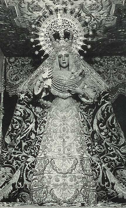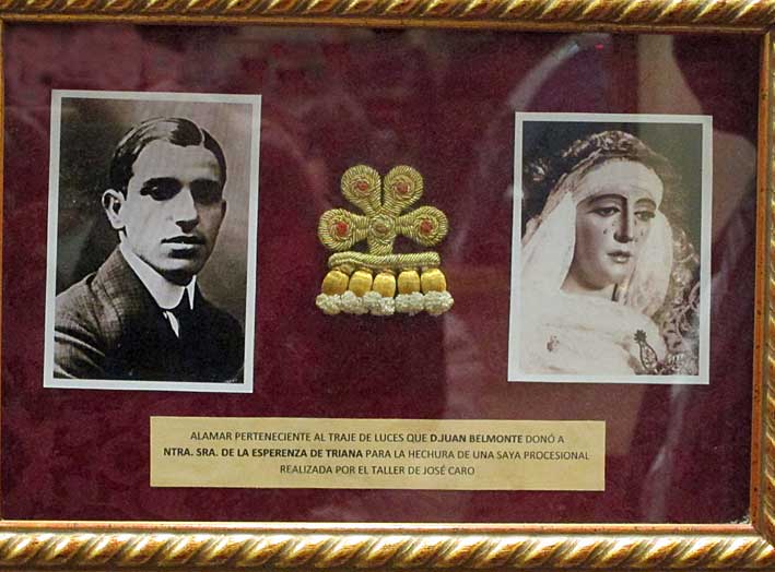 El Pasmo de Triana ( nacido curiosamente en la calle Feria ) era mucho de su Hermandad del Cachorro donde salía de maniguetero de la Virgen del Patronicio , lo que no quita que le regalara a la Esperanza de Triana uno de sus trajes con lo que en 1947, según diseño de José Recio y en el taller de Caro se realizara esta bella saya torera que uso la Virgen de la calle Pureza durante diez años hasta 1957 y que se puede ver en infinidad de fotos en glorioso blanco y negro. La pueden ver en las fotos inferiores .-