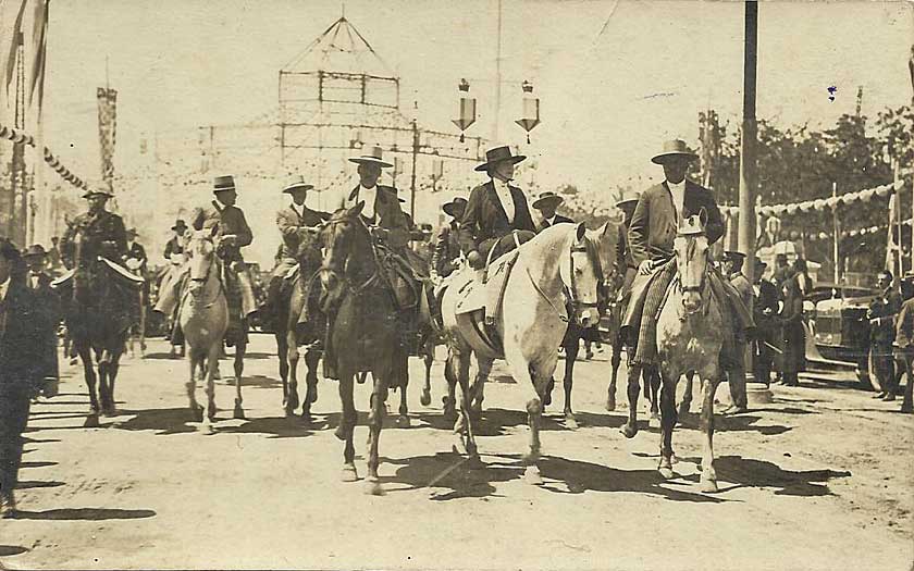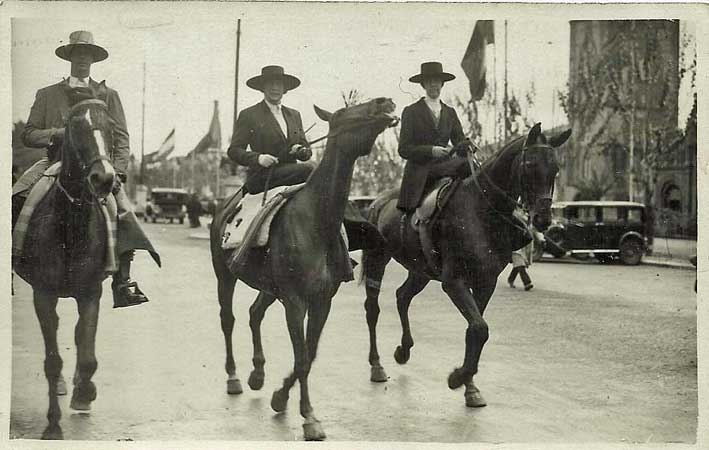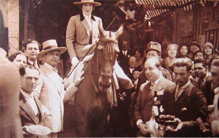 foto en sepia , la vemos sobre una jaca castaña y un traje gris perla,