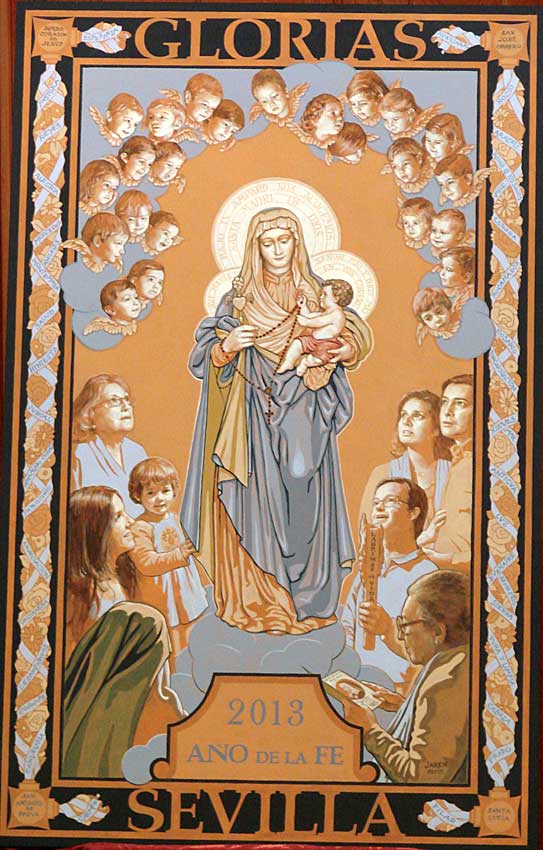 14 de Abril de 2013 Aunque estamos en plena "cuaresma" de Feria , los que tiene a bien y a mal seguir estas lineas, saben que las Glorias de Sevilla ( las Glorias de verdad, no esa tonteria del pregón de Carlos Herrerra de : "A la Gloria sevillanos a la Gloria" ) , son una parte importante de esta página ( no blog-libreta ) .- Ayer, fue presentado el cartel de las Glorias, en el Circulo Mercantil , donde con su presidente a la cabeza D. Práxedes Sánchez Vicente, vuelve a llenar un inmeso vacio de otras instituciones sevillanas ,en los que no solo a la Semana Santa, sino a la Glorias de Sevilla se refiere (quien sabe igual algún dia hasta se equivocan y le otorgan al Circulo Mercantíl, El Llamador o un premio Demófilo, aunque ahora que lo pienso, ni puñetera falta que les hace ) .- El cartel obra de D. José María Méndez, que hace un auténtico alarde de su absoluto dominio del retrato , de hecho se ha "jinchado" de hacer retrato , exactamente treinta y uno, mas los de la imagen central de la Virgen de la Amparo y el Niño Dios . Sin duda pasará al Guinnes (Aljarafe ) Record del los carteles de Sevilla, por ser el donde salen mas personas . Además como ocurre con la candeleria de la Virgen del Refigio de San Bernardo, en la orla que lo enmarcaestan nombrada todas las devociones marianas de Sevilla, en este caso letíficas .- El cartel tiene una enorme carga simbólica, con texto , lemas asi como de todas las personas que REPITO, son magistralmente retratados en el mismo en torno a una de las devociones con mas solera de las Glorias sevillanas como es la Virgen de la Amparo .Hasta ahi todo esta muy bien .- Pero, pero, quizás a nuestro Consejo , al autor del cartel ( vaya por delante su libertad artistica ), le ha faltado el puntito de sensibilidad de recordar la letra de una sevillana : Nacío en la Cava,