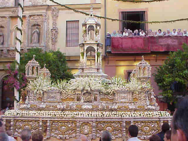 La festividad del Corpus Christi se celebra en Sevilla en jueves, este año será el 30 de mayo. Los Corpus de la Magdalena , Triana y San Isidoro entre otros se celebrarán en domingo ( dia liturgicamente señalado por la Iglesia Católica ) y el lunes 3 de Junio como les decía volveran a salir por la rampa , la Virgen del Voto, el Niño Jesús y la Custodia de la Sacramental de Pasión sobre el incomensurable paso del Señor de Pasión .- Al parecer nuestro Pastor en su visita el Jueves Santo pasado mostró un vivo interes por la recuperación de todos los actos sacramentales de la Hermandad y la Colegial , cuya procesión necesitará ( y seguro que contará ) con la aprobación del inminente Cabildo de Oficiales de la Hdad ; asi como el visto bueno de la parroquia que reside en San Isidoro, que vista del interes mostrado por nuestro arzobispo, no creo que cuente con muchos reparos .- De verdad que debemos de felicitarnos, pues era una de los Corpus mas hermosos que había en Sevilla. Por cierto , a esto le llaman algunos primicia, exclusiva y cosas de esas .- La Custodia de Pasión en el Corpus Pasión Sacramental |