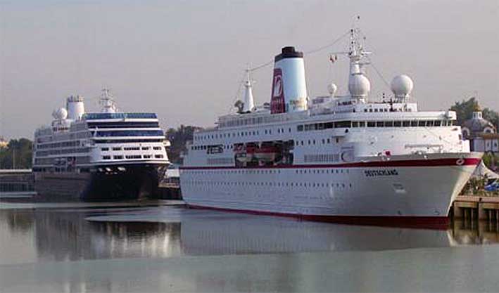Se trataba del Azamara Quest , que vino a Feria ( VER ) , buque hermano gemelo del Azamara Journey ,y el crucero MS Deutschland . Sevilla no tiene costa, pero tiene puerto de barcos , con el único rio navegable de Ex-paña como mis niños de la LOGSE autonómicas no saben .- Azamara Quest pasando por el puente móvil de las Delicias y con destino Gibraltar, mientras se queda el Deutschland en el Muelle de las Delicias para zarpar más tarde. MS Deutschland pasando por