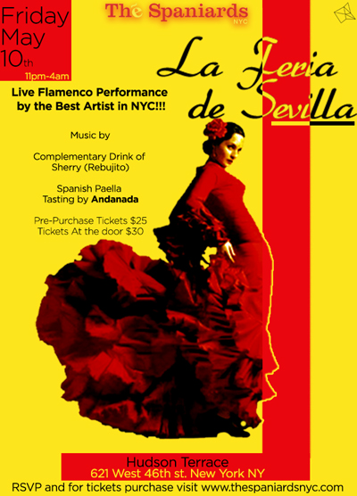 Como ponen en la publicidad, con la entrada va incluida una copa de rebujito y paella . Aunque los trajes tradicionales no son obligatorias pero se le anima y se visten las mujeres como "Gitana", ( no de faralaes ) entrará de balde . Para mas información : http://www.thespaniardsnyc.com/special_events.html .- Asi que ya saben, si algún amable lector o desagradable detractor , le pilla por esas tierras y tiene gana de tomarse un rebujito y marcarse una sevillana , ya sabe farolillos, flamenquitos , copitas y por las fotos no se un buen ambiente, ( por favor manden fotos ) en la ciudad mas cosmopolita del mundo y donde hay la mayor mezcla de razas y culturas, por metro cuadrado, nuestra Feria de Sevilla tendrá unos cuantos de esos metros y su cuota de protagonismo, en esta exportada Feria que hay que sumarlas a la de China y Nairobi como vimos en Sevilla(nos) por el mundo Estas fotos corresponde a la Feria de Sevilla en Nueva York del año pasado