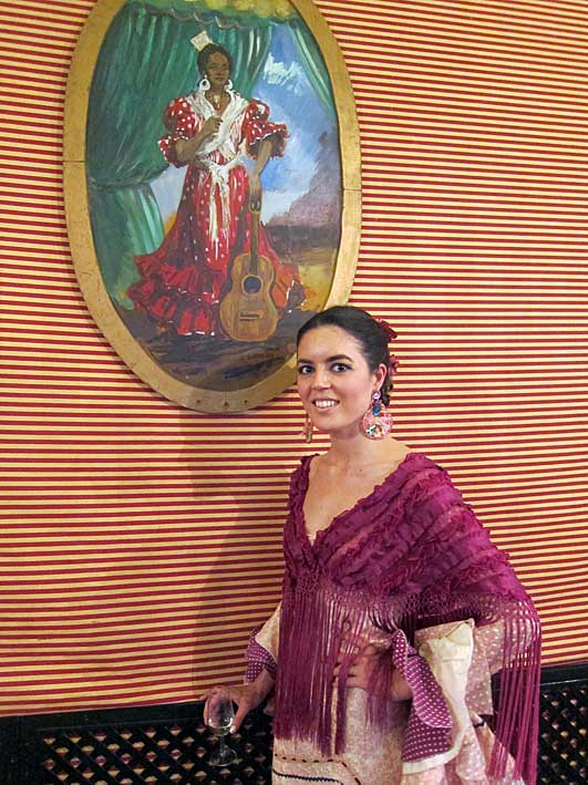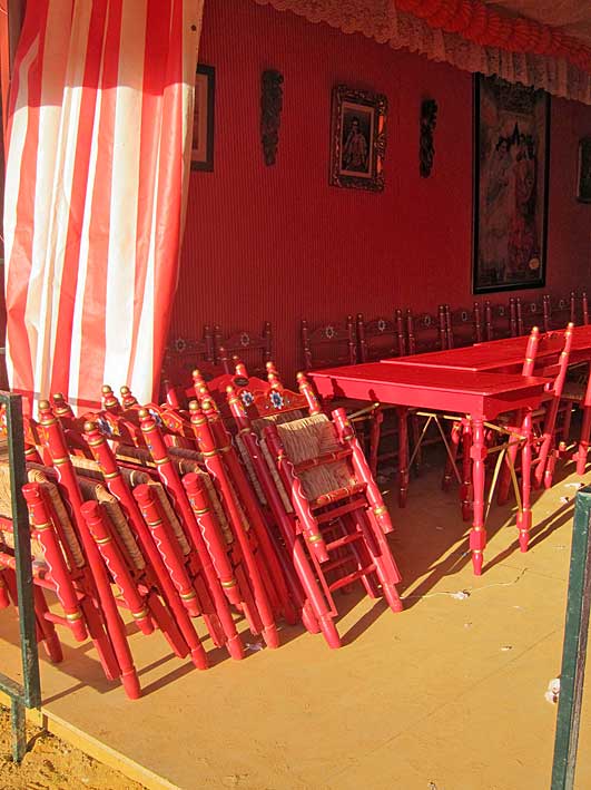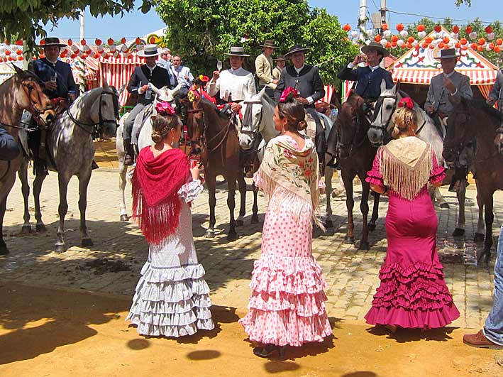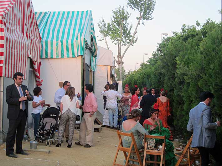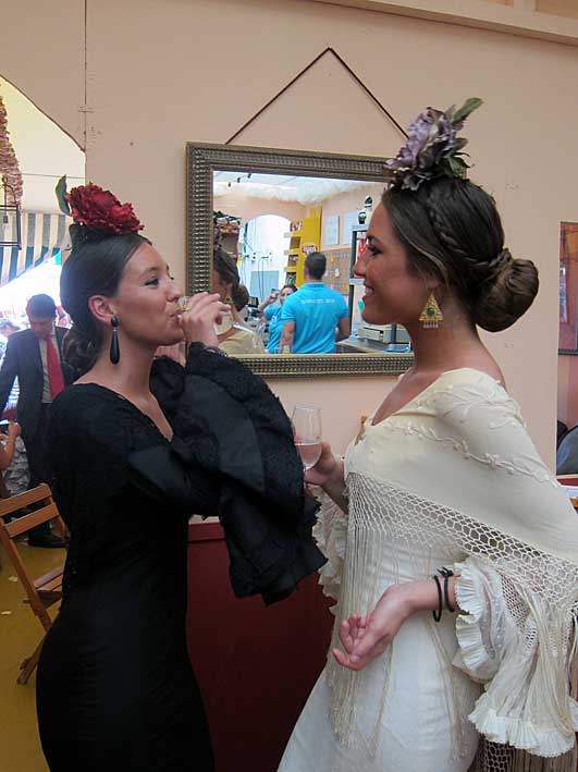 Inventos feriantes de sillas y mesas plegables......sevillanas . Innovación y tradición .- Como dice la letra de la sevillana " Nosotros con los caballos con sombrero y chaquetilla // Nosotras vamos andando y cantandole ......." En la Feria no se bebe , se le da conversación a la copa como estas dos guapas flamencas Flamencas - propaganda repartiendo abanicos .....se los quitaban de las manos, pero de verdad por " las calores" que hacia Perfección Cuidando los detalles Claudia Alfaro de Entre cirios y volantes Si ayer veíamos casetas con patio ,