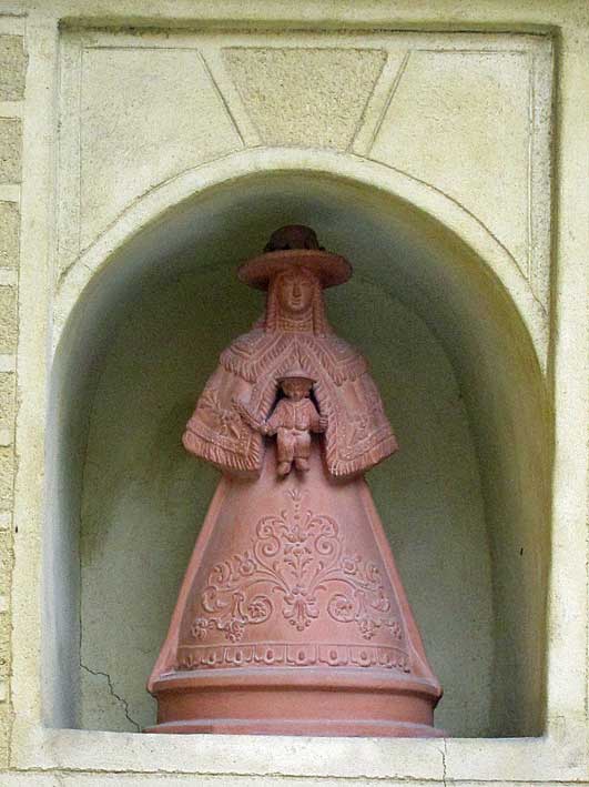 Este no es el caso que les traigo hoy . En la recoleta y bella barreduela Dos Hermanas, asi llamada por el ducado de la vecina localidad perteneciente al linaje de los Estuñiga que eran los propietarios del colindante Palacio de Altamira ( lo poco que queda de él ), en una de sus paredes junto a un anta ,( la columna embutida en una esquina ) se encuentra esta hornacina en plena vía pública dedicada a la Virgen del Rocío de Pastora en barro o terracota .-.