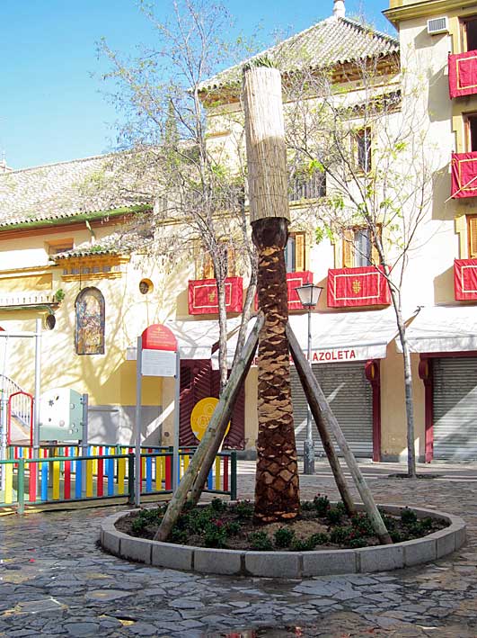 Lo mismo que desde aquí denunciamos lo malo, tambien hay que decir lo bueno y como nunca es tarde si la dicha es buena ( total solo han tardado diez meses, se lo han tomado con tranquilidad ) se ha respuesto por lo menos una, que esperemos que no sea atacada por ese odioso insecto del picudo rojo, cuya plaga que tantos extragos ha causado en casi todas las palmeras de Sevilla, menos en la que cabalga Zaqueo , bajando la rampa del Salvador . - Con toda seguridad el testigo a lo The Walking Dead que regresó de la tumba, para acusar a un hereje y que según cuenta reposaba bajo ella ,( si no lo saben deberia leer esta historia-leyenda digna de Cuarto Milenio : VER ) , descansará ahora mas tranquilo, al quedar cada cosa en su sitio .Curiosamente el origen de San Juan de la Palma , viene precisamente de esta meritada historia - leyenda , ligado a este "monumento natural" seña de identidad del templo , Hermandad y su colación .- En la Gavidia no ha habido tanta suerte, pues tras el palmerazo , el pasado Enero, han puesto en su lugar dos magnolios .- Ahora ya lo único que queda para terminar de recuperar el perdido encanto visual que tenía, una de las plazas mas bellas y recoletas de Sevilla, sea la desaparición de ese parque infantil de colores chillones digno de una hamburgueseria, asi como el aparcamiento de bici-tiesos , que chirrian a la vista .- San Juan ha recuperado su palma . Menos da una piedra .- |