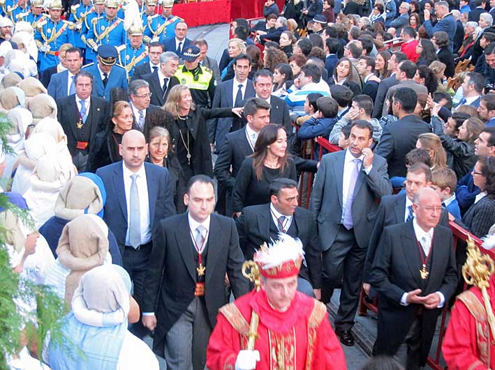 CRÓNICAS GRÁFICAS DEL JUEVES SANTO 2013 La corporación municipal de Sevilla de regreso de los oficios de la Catedral . La banda municipal tocó y todo . Acabarian agotados, la falta de costumbre .- |