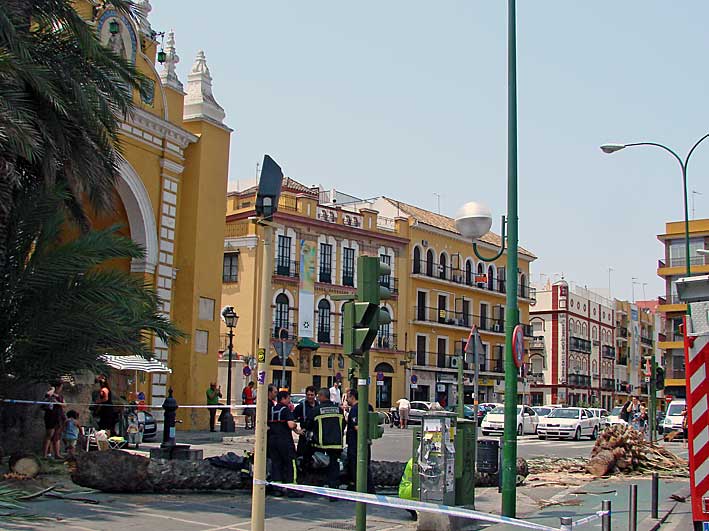 Aunque analizando la ubicación de la palmera frente por frente al parlamento andaluz ( con minúsculas ) y al enterarse que Griñan se va dejando huerfanos de lider politico a los andaluces y andaluzas, todo un drama, igual la meritada palmera decidió suicidarse . Tampoco sabemos si se habian practicado una ERE entre los picudos rojos que la atormentaban o el motivo del suicidio es que estuviera o estuviese implicada en alguna de las EREs fraudulentas . Aqui vemos en la imagenes superiores los bomberos cual click de Playmobil, tratando de hacerle una reanimación cardiaca , pero sin existo .- Otra de las opciones que se barajaban, era que la sufrida palmera sabedora de que ayer tambien desde alli se organizaria y saldria un año mas la cabalgata cabaretera , donde lesbianas, travestis, homosexuales y bisexuales, monstrarian un año mas sus morbideses y michelines, entre una lluvia de preservativos, para absurdamente reividicar todo lo que ya tienen; antes de ver semejante espéctaculo prefirió poner fin a su vida, lanzadose se al vació con fatales consecuencia En estas fotos vemos como en plan "CSI Macarena" , rodeada por cintas policiales, le practican la autopsia in situ trozeandola .- Si "Los arboles mueren de pié" y "Los cripreses creeen en Dios" , aqui en Sevilla las palmeras simplemente se escoñan contra el suelo .- .-