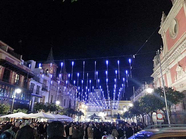 6 de Diciembre de 2013 Parafraseando el inmortal bolero "La Mentira", mas conocido como "Se te olvida" del inmortal Alvaro Carrilo y que popularizaran desde Los Panchos hasta Ana Belén, a los que hayan diseñado, instalado y autorizado esto que ven en la foto superior, "se les olvida" que ademas del Arco de la Macarena , estamos ante un monumento que corresponde a la ampliación realizada por el sultán Ali ibn Yusuf en el siglo XII, y cuyo aspecto actual es fruto de una remodelación llevada a cabo entre los años 1723 y 1795, en la que los elementos arquitectónicos islámicos fueron sustituidos por el aire clasicista que presenta en la actualidad .- Se les olvida, que es la puerta de Sevilla por donde han entrado mas reyes y emperadores , curiosamente por separado Alfonso XI de Castilla en 1327, Isabel I de Castilla en 1477, Fernando II de Aragón en 1508 ,( los de verdad, no los de la serie "Isabel" ) ; el Emperador Carlos I de España y su prometida Isabel de Portugal en 1526, y por último Felipe IV en 1624.- Se les olvida, que el 1 de noviembre de 1908 fue declarado Monumento Nacional: "Oficio de traslado del Ministerio de Instrucción Pública y Bellas Artes en el que se comunica Real Orden por la que se declara Monumento Nacional el tramo de muralla comprendido entre la puerta de la Macarena y la de Córdoba"; y que los restos de puertas y murallas de la ciudad fueron declarados en 1985 como Bien de Interés Cultural, bajo la categoría de monumento .- Hoy todo eso por la noche, con la hortera y vulgar iluminación que aqui ven ( foto tomada con un movil , no hay fotochó de por medio ) recuerda mas a un bazar de chinos o inclusos cosas peores .- Esto que ven aqui, no es obra de una tipa extranjera que le puso una rebequetica de croché al Cid ( a saber el dinero que nos costó todo eso ) para que fueramos mas cultos y modernos, y en agradecimiento la autora le dió por disfrazarse de Dolorosa , esto está hecho en Sevilla y autorizado por sevillanos .- Zoiodolandia padece de una grave ataque de bombillitis de colores aguda, algo que no es justificable por las próximas Navidades, pero lo grave es que este año la cosa literalmente se ha salido totalmente de madre, al atentar literalmente de forma visual con monumentos como el Arco o de la Macarena o un entorno monumental como la Plaza del Salvador disfrazándolo de decorado de una pelicula de ciencia ficción .-