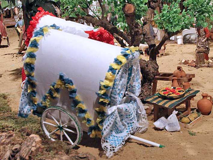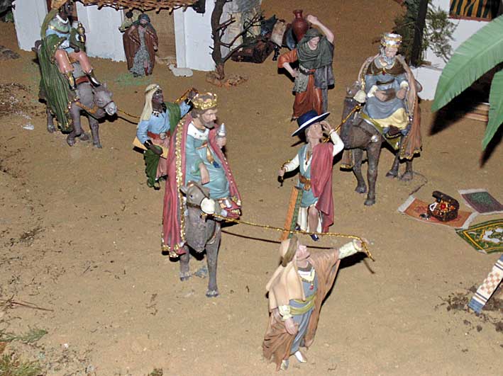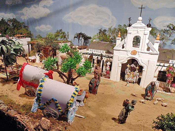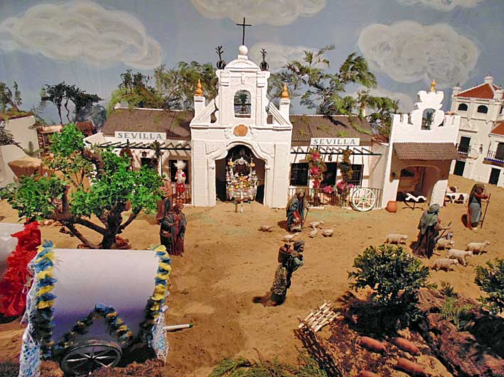 29 de Diciembre de 2013 Hoy les traigo un Belén tan roiero como sevillano, el de la Hermando del Rocio del Salvador o Sevilla ( o como la quiera llamar ), situado en el patio de los naranjo del Iglesia del Salvador de toda la vida de Dios ( hoy parque Temática Colegiata ).- Es una recreación de la aldea del Rocío y además tiene muchos curiosos detalles tanto de maquetas arquitectónicas, como entre las figuras que forman este original Belén .- Uno de los pajes que lleva un camello lleva un sombrero de ala ancha Entre las carretas exactamente igual de exhornada como salén para el Rocío desde Sevilla se puede ver una paella con todos sus avios La casa hermandad en el Rocío y la carreta del Simpecado Lo que no se muy bien que hace en la puerta un armao de la Macarena El Santuario de la Virgen del Rocío hasta el mas minimo detalle , incluido mas abajo el pocito del Rocío Además de este Belén
