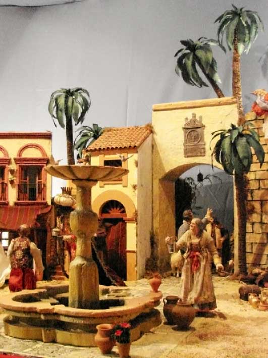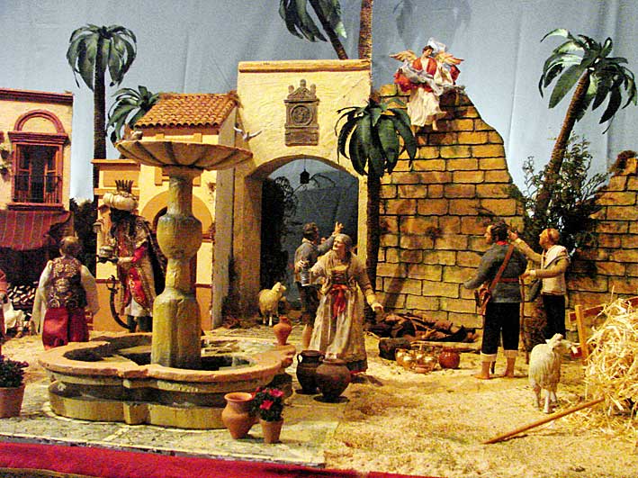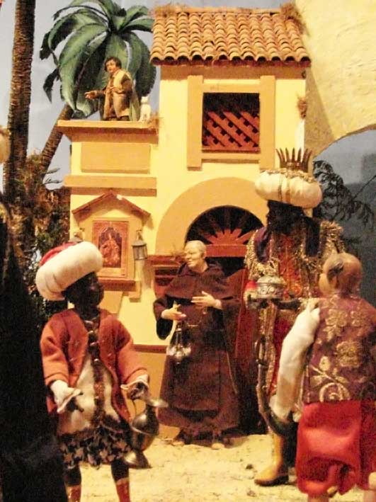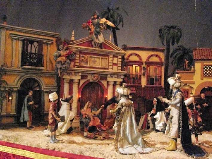 25 de Diciembre de 2013 El Belén Napolitano de de la Iglesia del santo ängel, no es un Belén de grandes proporciones , pero si tiene muchos detalles simbólicos, asi como representa como telón de fondo monumentos de Sevilla , mas que recomendable su visita y está cerca de la voragine de Zoidolandia en la calle Rioja . No dan globos, pero su viisita es mas que recomendable .- En el podemos ver claramente que este año ha sido incluido el Postigo del Aceite de Sevilla Si se fiján vera una nueva figura realizada por Antonio Díaz Arnido para este Belén y que tiene una pequeña y entrañable historia . Representa, un retrato del hermano Humberto Valencia, un fraile de la Orden Carmelita Descalza, cuya afición al Belenismo, y el desarrollo de esta faceta, fue tal que incluso en uno de sus destinos como fraile, San Fernando( Cádiz), uno de los premios que otorga anualmente su Asociación Belenista- el de Nacimientos Populares- lleva su propio nombre como homenaje .- El hermano Humberto falleció hace unos meses en su último destino, en Sevilla. Esta triste circunstancia, hizo que se realizara una figura para este Belén napolitano. La minuterie ( gafas, incensario- por su condición de Sacristán-, rosario, cinturón y sandalias) han sido realizadas por Manuel A. Ruíz- Berdejo.-