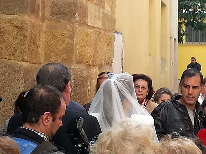 La Costanilla mediodia, salvo por una gran presencia policial ( cosa rara la policia local sin poner multas a dos amnos ) y mas raro aún, lo limpio y escamondadas que estaban las aceras y calzada , todo parecía un sábado normal , con una boda normal con las inevitables señoras y señoritas disfrazadas, mas que vestidas, para este tipo de eventos como suele ser habitual .- Pero no, en la Parroquía de San Isidoro se iba a celebrar la boda del hijo del alcalde de Sevilla, que en esta ocasión ejercia de D. Juan Ignacio Zoido, de padre y muy señor mio, mas que de @zoidoalcalde . Así que abandoné mi botellín que tomaba placidamente en el bar de esquina, y tuve que ejercer sin oficio y sin vocación de paparazzi modelo Hola y de propina sin una cámara adecuada .- Oiga esto es mas complicado que una salida procesional de Gloria, en las procesiones la lucha es por las alturas con los tontos de los palitos, mientras que aquí se forman auténticos tumultos, incluso dandose el caso de un pequeño incidente entre un miembro de la seguridad y un reportero gráfico, que este último a voz en grito no tuvo por menos que quejarse de una forma absotutamante inadecuda que no paso a mayores .-