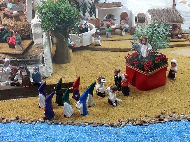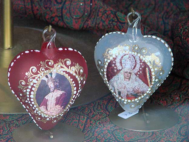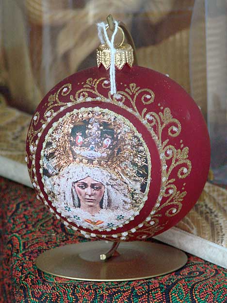 La foto superior corresponde a esta especie de feria de muestra de belenes a lo Plaza Mayor sin Chencho, montada entre dos edificios Patrimonio de la Humanidad, como la Catedral y el Archivo de Indias , con lo que aqui gusta una carpa, un chirriguito, un tenderente o una arquitectura efímera , pues en uno de sus escaparates donde están los dioramas de belenes y nacimientos nos encontramos con lo que ven en la foto superior . Un paso de la Borriquita, sus nazarenos, un cardernal, su capataz, sus costaleros , sus monaguillos y de propia lo contemplan una serie de monjas , acompañadas de Quijote y Sancho . ¿ Exactamente que coño ( sin perdón) tiene que ver todo esto con un portal de Belén ? .- Pero la cosa se complica tela, cuando no en estas muestra belenisticas, sino en una tienda en un lugar indeterminado de Sevilla ( no es cosa encima de hacer publicidad) uno se encuentra con una serie de bolas de arbol de Navidad , donde vemos a la Macarena, al Señor de la Salud de la Hdad de los Gitanos o la Virgen de las Mercedes de la Hdad de Santa Genoveva.- Otros colgantes navideños