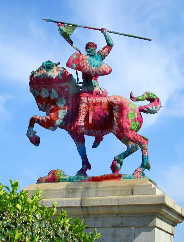 Vamos a ver, aquí no se hieren sensibilidades ningunas, simplemente fue motivo de un tremendo y mas que justificado cachondeo en nuestra prensa local; exactamente el mismo que se puede formar con la nueva "víctima" propiciatoria de esta buena señora Olek, que en vez de dedicarse a hacer crochet en su casa, para hacer pañitos para el sofá de la sala de estar, cubrir el royo de papel higiénico o la boca ancha de un búcaro para que no entre los bichos, se dedica a ir dando por alma por toda las ciudades del mundo, forrando los monumentos de crochÉ y de esa manera los respectivos ayuntamiento van ejerciendo de "modernitos" y de "proges" .- De verdad, deberíamos hacer una suscripción popular para que esta señora Olek , le haga una rebequita o una bufanda de crochet a nuestro @Zoidoalcalde ,y que por favor nos deje de mas tonterías , que ya tenemos bastante con las luces de la Feria de Málaga en Navidades, el mapping o las horteradas efímeras de las carpas por todas las plazas . Nuestro Juaninasio , tiene síndrome de junta de gobierno dejando impronta ( verbigracia Montesion, cargandose su Rosario de la Aurora o El Amor modificando uno de los Misterios mas emblemáticos de Sevilla ) . Por favor que alguien le dedique urgentemente un azulejo donde diga : AL EXCMO SR DON JUAN IGNACIO ZOIDO - DEJÓ SEVILLA COMO ESTABA – ( que ya es bastante ) .- Tiene cojones ( sin perdón ) que a nuestro caballo del Cid, el que mas veces sale en el Tiempo de Roberto Brasero, marcando temperaturas superiores a los 40ºC, donde se fotografían todos los turistas cogestionados y colorados como tomates, señalando al termómetro de marras, con una mano y la botellita de agua en la otra ahora le pongan una jodida rebeca de crochet .- Por favor respeten este universal monumento igual que es respetado en todos sus enclaves del mundo mundial donde está colocado : LOS HERMANOS CLONICOS DEL CID LOS HERMANOS CLONICOS DEL CID ( II ) LOS HERMANOS CLONICOS DEL CID ( III ) EL CID DE SAN FRANCISCO LOS HUNTINGTON OLVIDANOS MECENAS DE SEVILLA LOS HERMANOS CLONICOS DEL CID IV Que tambien ha salido en varias películas como Ciudadano Kane o Vértigo, sin ningun modelito de esta artista neoyorkina , la cual si esta aburrida, se podría entretener cubriendo de crochet, toda la Torre Pelli CacaSol, las setas de la Encarnación o todos los veladores que hay en Sevilla ( para esto último le iba a faltar hilo ) .-