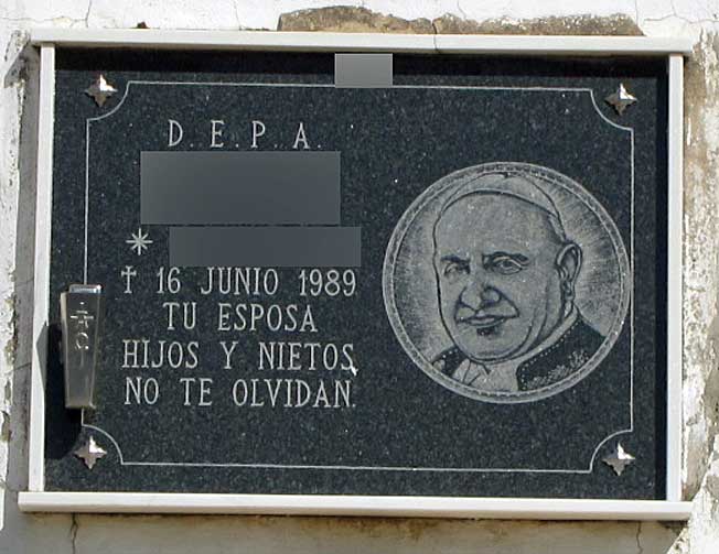 La superior esta representado el Papa Juan XXIII ( que estuvo en Sevilla siendo el cardenal Angelo Giuseppe Roncalli ver Juan XXIII )y la fecha de fallecimiento del finado/a es 1989 . En este punto es bueno recordar que Juan XXIII , no fue beatificado hasta el 3 de septiembre de 2000 por Juan Pablo II, y alcanzará la santidad el próximo 24 de Septiembre de 2014 con el Papa Francisco I . Como vera la devoción de este señor o señora fue mas que profética .-