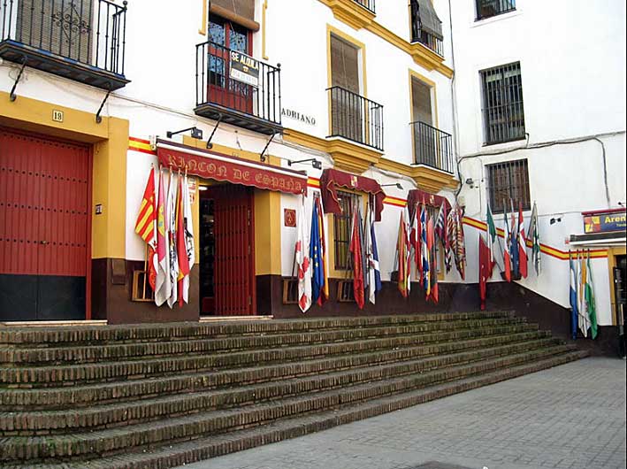 Pues oigan a qui en Sevilla tenemos la grada de Adriano pared con pared con el coso baratillero ( como diria un cursi ) , que estaba muy bien como estaba junto a esta tienda que pone de los nervios a los "twitter flauta" y a los "tontos de la banderita republicana", y que como puede apreciar la antigua grada de ladrillo taco a la tabla estaba perfectamente ( ver foto superior ) , estando en perfecta armonía y continuidad arquitectónica con la Plaza de Toros de Sevilla , tanto como la pintura en que esta enmarcada las puertas, como el color de estas .-