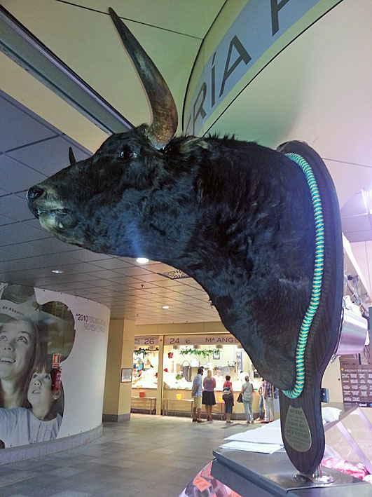 No se si recordaran, hace un tiempo les traje un texto títulado Toros y bares en Sevilla , pues miren ustedes por donde dando una vuelta por las plazas de abastos o mercados sevillanos se encuentra uno con cosas como estas . El primero que ven, y al que corresponden estas dos primeras fotos es un toro que hay en un puesto de la despersonalizada plaza de la Encarnación , bajo el engendro la de las ruinosas setas, que estan contruida en el que fuera o fuese auténtico Mercado de la Encarnación , con su Pomona incluida .-