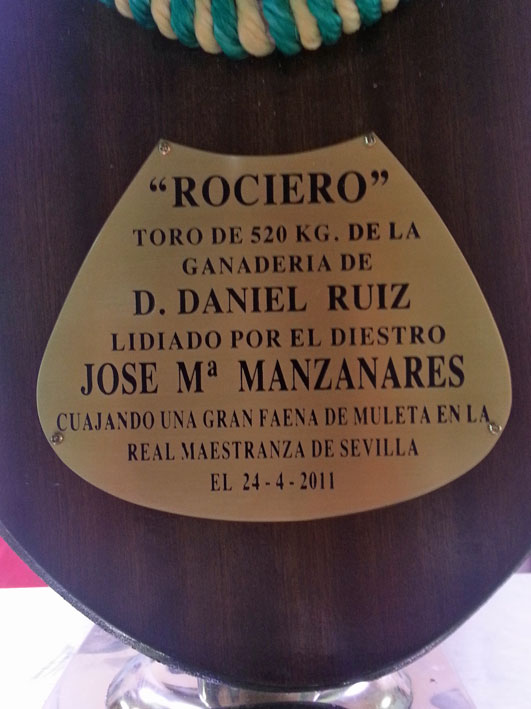 Como reza en la placa es el toro Rocio de la ganaderia de Daniel Ruiz lidiado por Jose Mª Manzanares el 24 de Abril de 2011, cuya faena la puede ver en el video inferior ( donde triunfo El Juli, por cierto ) .Seis dias después el maestro Manzanares pasaría directamente a la historia de la Maestranza , al ser indultado el primer toro ( que no astado ) en la plaza de toros de Sevilla, de nombre "Arrojado", negro mulato de 500 kilos, de la ganaderia de Nuñez del Cuvillo ( al ser indultarlo es mucho mas complicado cortarle la cabeza de recuerdo ) lo pueden ver AQUI .-