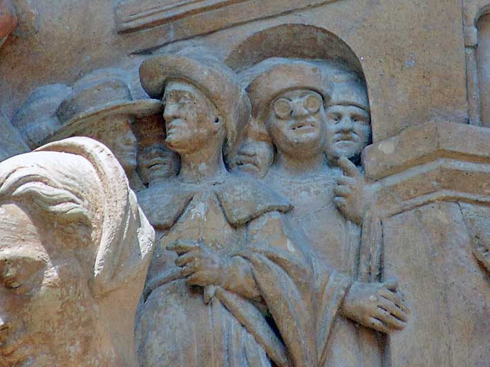 Pues gracias a estas fotos con muchisimos megas ( como ocurrió cuando le traje aqui hace tiempo los rostro de las vidrieras de la Catedral ), se descubren cosas que escapan a la vista humana, cosas que siempre es estimulante redescubrir y que tenemos delante. El Sr Galindo que vino de visita a nuestra ciudad al ver en su ordenador las fotos realizadas en su viaje reparó en un personaje de los "extras" en la escena de la Adoración de los Reyes Magos ....con gafas .-