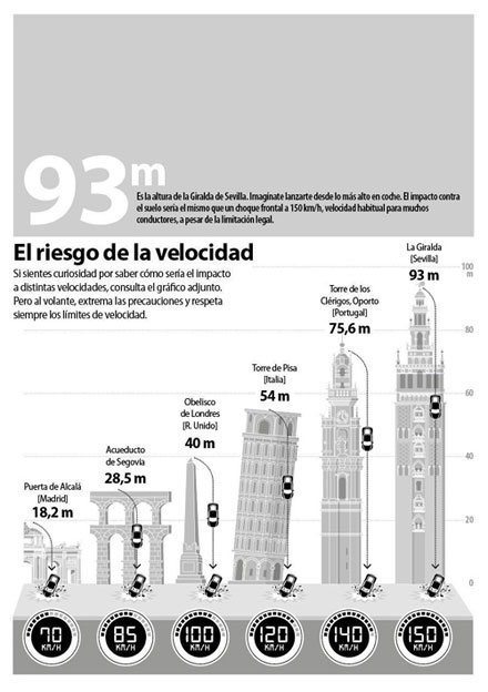 El texto que aparece en la parte superior dice : "93 metros es la altura de la Giralda imaginate lanzarte desde lo mas alto en coche . El impacto contra el suelo que seria el mismo que un coche frontal a 150 km/h velocidad habitual para muchos conductores a pesar de la limitación legal".- Esta claro que la mente preclara que ha diseñado esta campaña, no ve la serie Mad Men y desconoce el concepto de publicidad negativa asociada como diría su protagonista el poliédrico Don Draper , algo tan básico como asociar una imagen a algo malo, como una multa-recaudatoria o muy malo como la propia muerte . ¿Qué peligro adicional hay por ir a 140 km/h en lugar de 120 km/h? A 120 km/h un impacto es mortal de necesidad, incluso con las medidas actuales de seguridad .- ¿No hay otro edificio alto en Ex-paña para usarlo de referencia que precisamente la Giralda de Sevilla ? . Quizás nuestro @zoidoalcade no ha reaccionado, porque estaba muy liado inaugurando glorietas dedicadas a sindicalistas de CCOO como Marcelino Camacho, que el hombre como todos sabemos era mucho de Sevilla, venía todos los años a salir de nazareno, despues venia a la Feria , hacia todos los años el camino del Rocío y no faltaba ni un Corpus, vamos tanto como Pilar Bardem .- De propina, no le ha temblado el pulso al afirmar en las redes sociales : "Sevilla ya tiene un rincón para recordar a Marcelino Camacho, un luchador incansable en defensa de los trabajadores". Monteseirin o el señor de la cachimba, ( que se hincharon de borrar calles e incluso estuvieron a punto de borrarlas a asesinados por los rojos, en los felices años de la II República ) no lo habrian dicho mejor, con la pequeña diferencia es que ellos son del PSOE e IU ,y nuestro actual alcalde es del PP ( se supone ), dejando a su decepcionado electorado ( entre ellos un arrependito servidor ) con cara de tonto haciendo por hacer cosas como estas .- Tras meterse un gol en propia puerta de glorietas, no estaba el hombre para salir a la palestra y decirle a la DGT que porque no van buscando otro monumento u otro edificio que no sea precisamente nuestra TURRIS FORTISIMA, para asociarla como les decía a una multa en una época de carteras tiesas o directamente con la muerte . Después de esta mas que desafortunada campaña, cualquiera cuando vea la torre que nos identifica a los sevillanos, lo normal es que diga lagarto, lagarto ( no precisamente de la Catedral ) .- A los que han diseñado esta maravilla, tendríamos que informarles que la Giralda, no mide 93 metros sino 98,5 m de altura (104,1 m incluido el Giraldillo). podrian haber utilizado el alminar de Kutubiyya de Marraskeck de Marruecos mide 68 metros; el Big Ben de Londres 105 metros; la Sagrada Familia de Barcelona 111 metros o la torre de la Catedral de Colonia 157 metros. Oigan y ya puesto la Torre Pelli CacaSol que si alguien le da por tirarse desde arriba con un coche, el carajazo puede ser mas que importante.- Confiemos que nuestro primer edil cuando termine de inaugurar glorietas sindicalistas ( con o sin mariscadas ) reaccione ante esta negativa publicidad de Sevilla a nivel nacional .- |