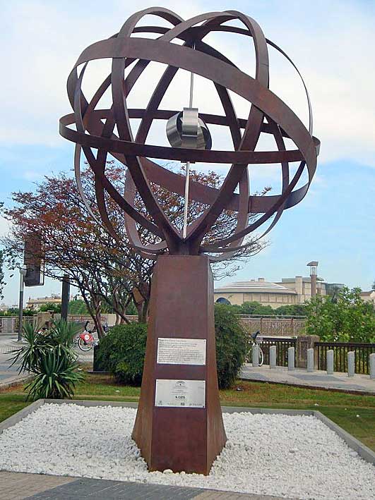 En la plaza de Cuba, podemos esta cosa extraña , que representa una bola del mundo oxidada , inspirado en la esfera armilar que figura en la portada del libro Suma de Geographia, de Fernández de Enciso editado por la Universidad Hispalense en 1519 ( a mi no me miren ) y que curiosamente hay algo parecido en el campus de la antigua Facultad de Derecho de la Universidad de Sevilla.( frente al Caballo del Cid ), donde los estudiantes se solazan y meten mano al Sol .-