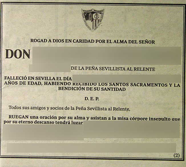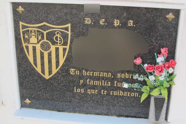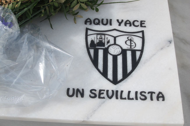 Lo podemos ver en esquelas como en la foto superior dedicada a un miembro de la histórica Peña Sevillista al Relente .- Aclaración las fotos que viene a continuación son absolutamente reales, están en el cementerio de san fernando de Sevilla y no son un montaje del adobo fotochó, donde lo único que se ha eliminado es la identificación de los finados .- Lápida donde aparece en solitario el escudo del Sevilla Esta lápida va mas allá y como pueden ver recalca en texto, en su parte inferior que : "AQUI YACE UN SEVILLISTA" Y por último como puede ver unos escudos sevillistas mas pequeños compartiendo sitio en la lápida con sus devociones religiosas |