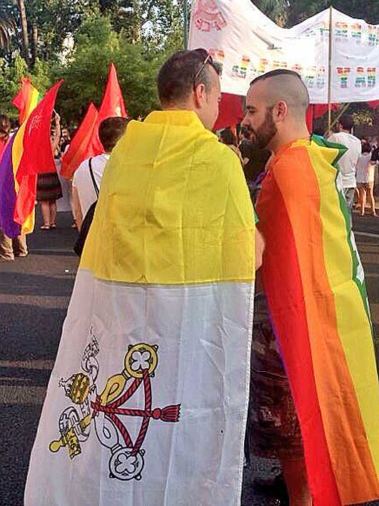 En la reciente (y ya transnochada ) cabalgata cabaretera del dia del orgullo de ser lesbiana , homosexual o travesti , recientemente celebrado en Sevilla, amén de la bandera que parece un estuche de rotuladores de colores que los representa ( y separa de la igualdad e integración buscada ) , una serie de participantes , no sabian muy bien a donde iban, donde estaban o para que estaban allí , y ademas del tradicional tonto de la banderita republiacana , te aparece uno con la bandera del Vaticano y nadie ha dicho esta boca es mía .-