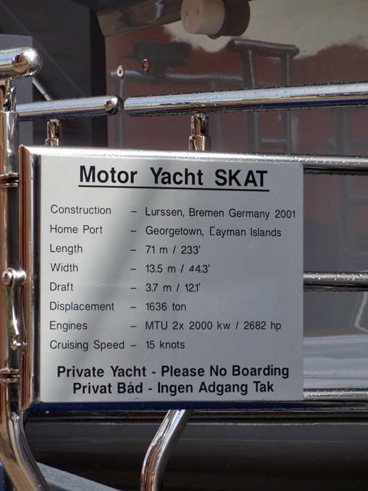 El Skat es un yate de lujo construido por Lürssen de Bremen , Alemania 9906 como un proyecto, un número bien visible en el casco en un tipo de letra equivalente a la de los buques militares. El proyecto se inició en noviembre de 1999 y el barco puso en marcha en 2001. El dueño es Charles Simonyi , es un ingeniero de software húngaro que supervisó la creación de la suite ofimática Microsoft Office. Actualmente dirige su propia compañía, Intentional Software dedicada al desarrollo y comercialización de programación intencional y es el quinto turista espacial. Yo creo que ya tiene pagado el recibo de la luz hasta que se muera .- Bautizó a su poderoso barco con el nombre Skat, una elección que casi roza lo irónico, ya que se trata de una palabra que en danés significa impuesto..Este megayate ocupa el puesto 32 en la lista de los yates más grandes del mundo.-