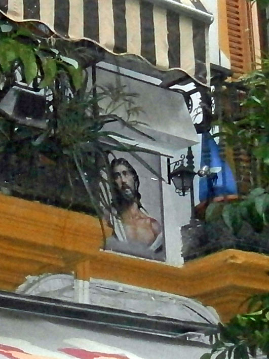 Por aquello de que el pasado fin de semana fue el siempre bien montado Besapiés de Jes´sus Despojado, un lector observador D. Joaquin Ortega Moreno , me remite estas fotos de un buen azulejo de Jesús Despojado sito en la recoleta calle Gamazo de nuestra ciudad . Como me comenta en su misiva : ".....entre el toldito del bar, los arboles, balcones y aparatos de aire está un poco oculto, siendo dificil de ver ".-