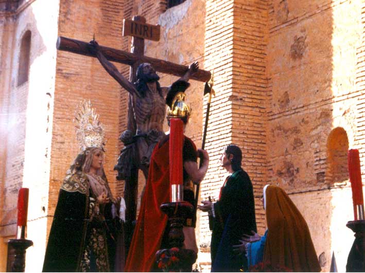 Se trata de la Real Cofradia del Santisimo Cristo de la Misericordia y Nuestra Señora del Mayor Dolor con sede en la Parroquia de Jesús Nazareno . El Crucificado se talló en 1975 y es de Francisco Palos Chaparro, y policromado por Francisco Buiza .- Asi mismo Maria Stma. del Mayor Dolor al igual que el Misterio ( San Juan , Maria Magdalena y un centurión romano tambien es obra de Francisco Palos Chaparro , procesionando el Viernes Santo .- Les traigo diferentes angulos, pues como pueden ver el parecido es mas que notable con el Cachorro de Triana .Juzguen por ustedes mismos .-