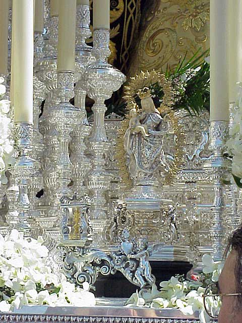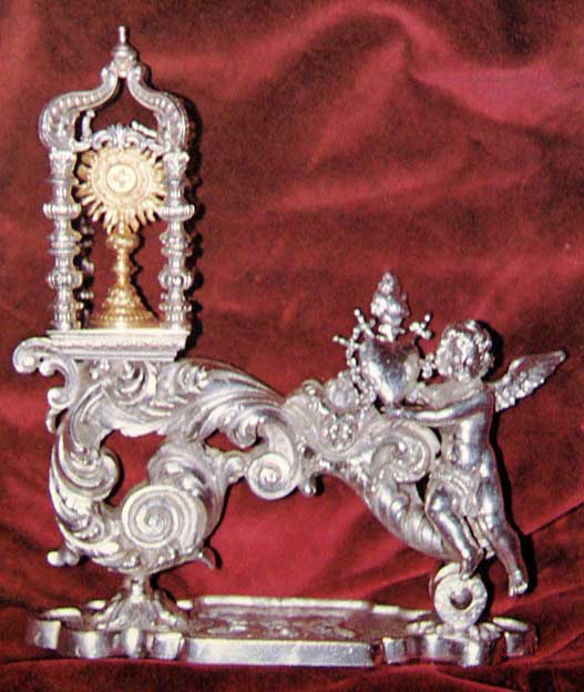 Fechado en 1995, realizado en bronce plateado , es obra de los Hermanos Delgado López, representando como puede ver roleso de hojas de acanto , con un templete y un ostensorio en su interior , al final un querubín llevando entre sus manos un corazón atravesado por espadas de dolor .-